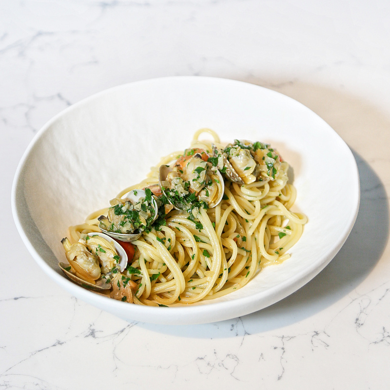 Состав: вонголе в/м, спагетти, томаты черри, чеснок, лук репчатый, вино белое, масло сливочное, масло оливковое, петрушка, микрозелень, бульон куриный, вода