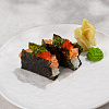 Состав: лосось, рис, тобико, соус спайси, морская капуста дол гим, лук зеленый, кунжут, имбирь, васаби, соевый соус