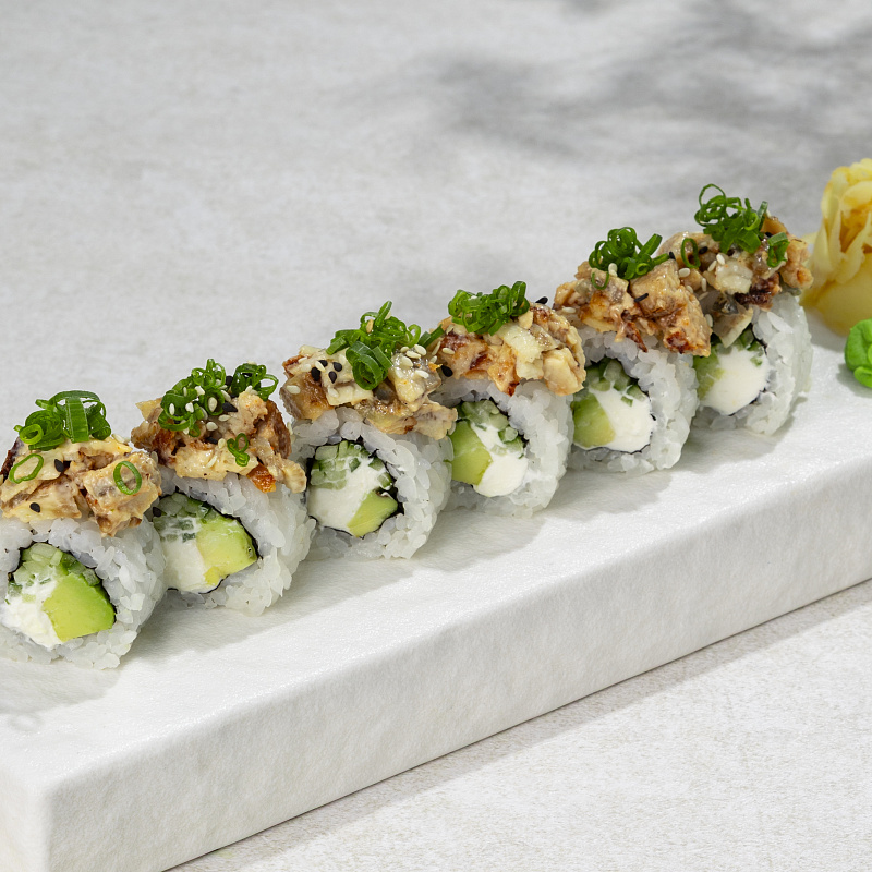 Состав: рис для суши, соус спайси, угорь унаги, авокадо, огурец, кремчиз, имбирь, васаби, соевый соус, нори, соус терияки, кунжут, микрозелень