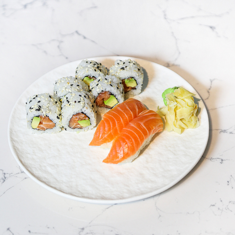 Состав: ролл с лососем и авокадо, нигири лосось 2 шт