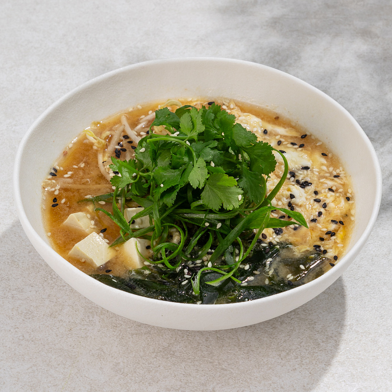 Состав: суп мисо, фасоль, вешенки, тофу, яйцо, соус кимчи, водоросли вакаме, кинза, лук зеленый, кунжут, кунжутное масло