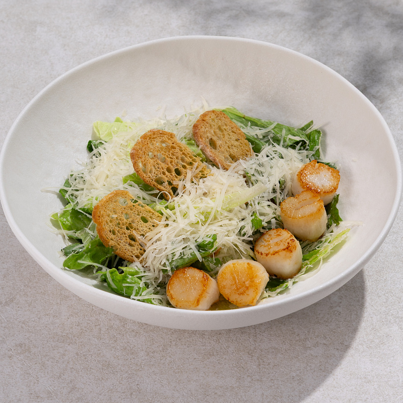 Состав: салат ромейн, гребешок 80/100, заправка цезарь, пармезан, багет