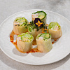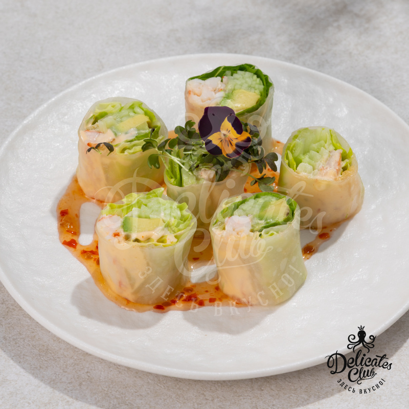 Состав: креветки ваннамей, авокадо, огурец, рисовая бумага, салат ромейн, лук зеленый, соус сладкий чили, соус спайси, микрозелень