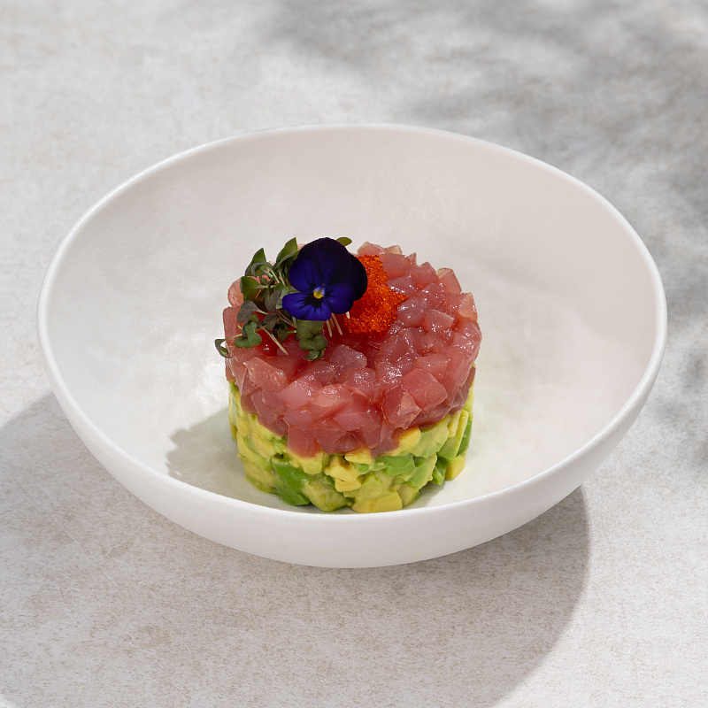 Состав: авокадо, тунец саку, тобико, соус понзу, соль, сахар, сок лайма, микрозелень