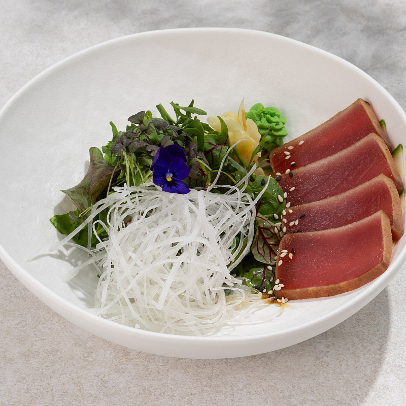 Состав: тунец саку, дайкон, соус поке, огурец, кунжут, соус терияки, васаби, имбирь, соевый соус, микрозелень, микс салат