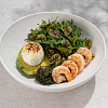 Плато со всем, что нужно для сытного и не тяжелого завтрака. Нежные, слегка обжаренные креветки, идеально сваренное яйцо с мягким желтком, зелень, хрустящие ломти багета и взбитое сливочное масло.