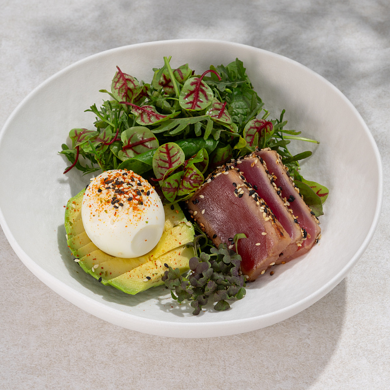 Состав: тунец саку, авокадо, микс салат, томаты черри, яйцо куриное, кунжут, микрозелень